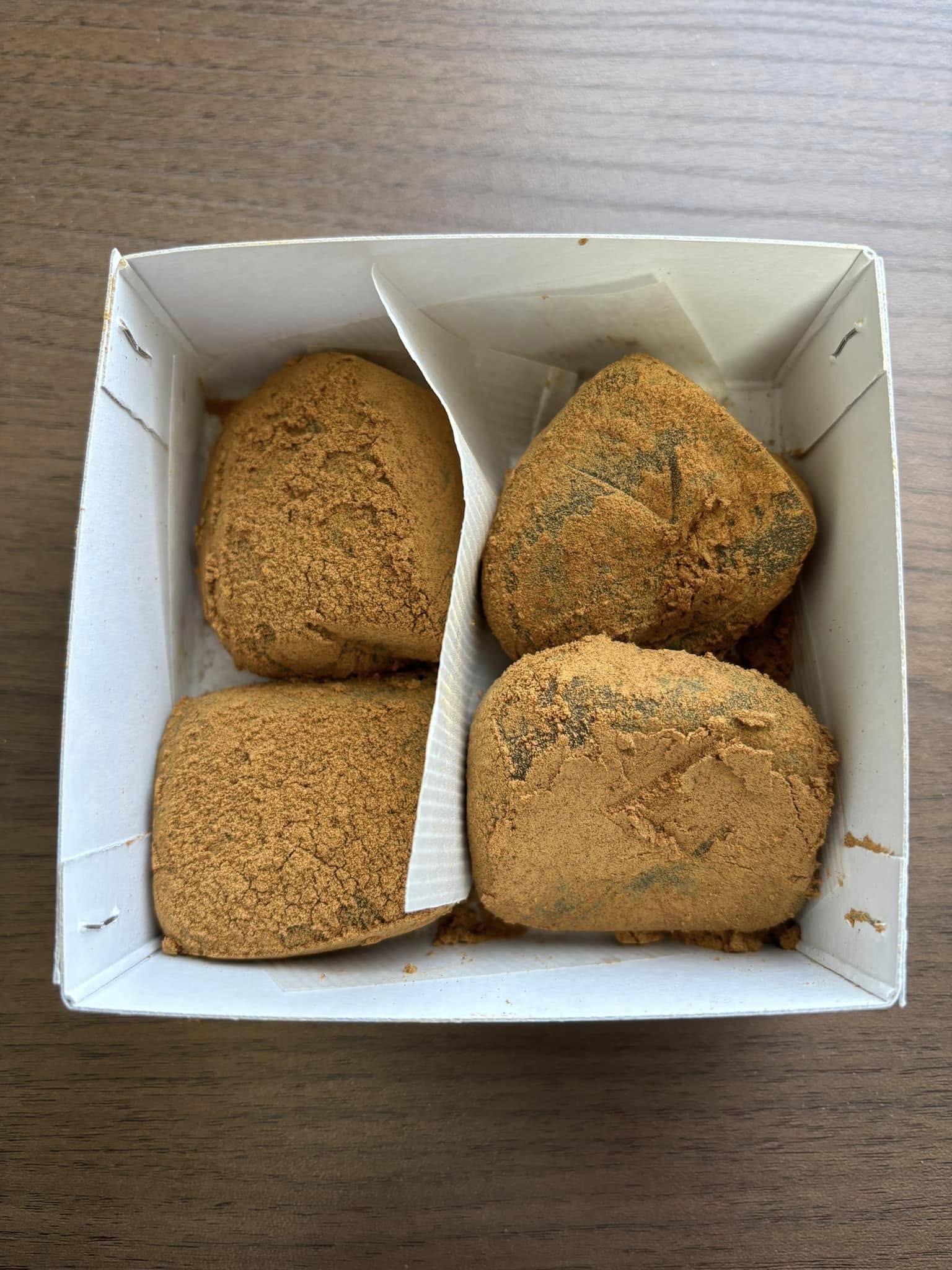 直正的蕨餅是用蕨餅將紅豆餡包裹起來,外面在撒上黃豆粉,猛一看有點像是饅頭或よもぎ餅,我個人認為這個作法的好處就是食用方便呢。